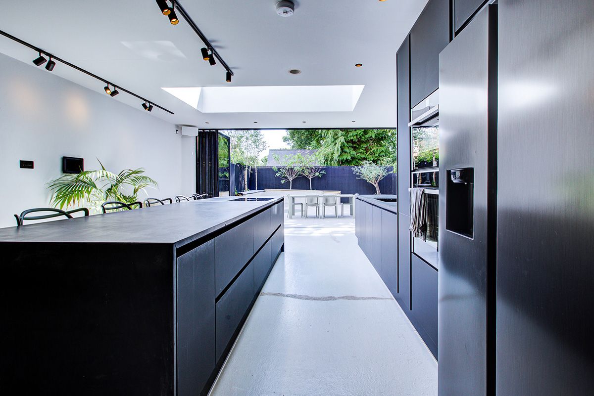 A wrap-around extension creating a large, open-plan kitchen and living space. Existing internal floor levels were lowered to improve flow and proportions throughout the new layout. The project includes the installation of approximately 10 metres of bi-fold doors, opening the kitchen-living area directly onto the garden and enhancing natural light and indoor–outdoor connection. Works also comprise a new MVHR system, a fully upgraded heating system, two new bathrooms, and a bespoke kitchen, delivering a modern, efficient, and high-quality family living space.