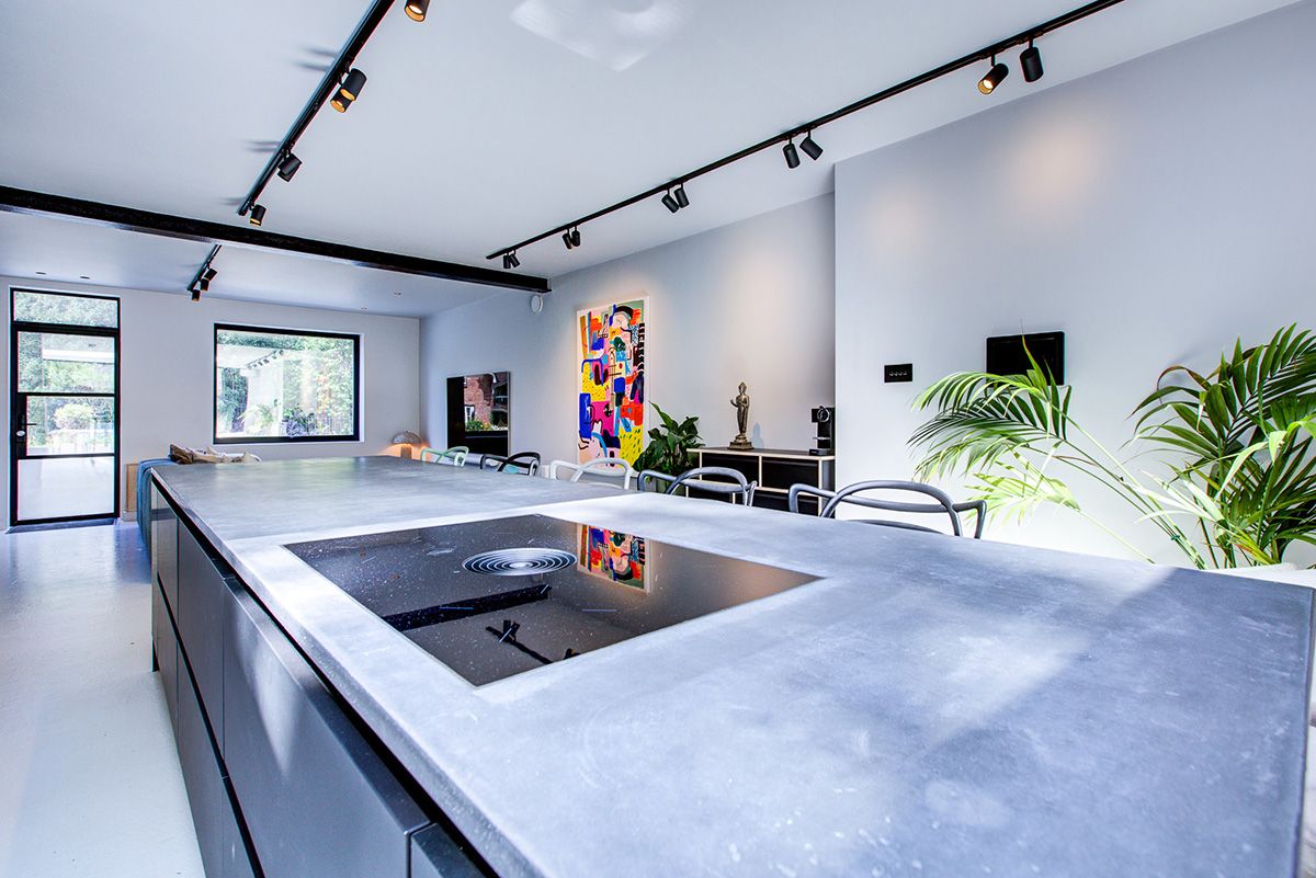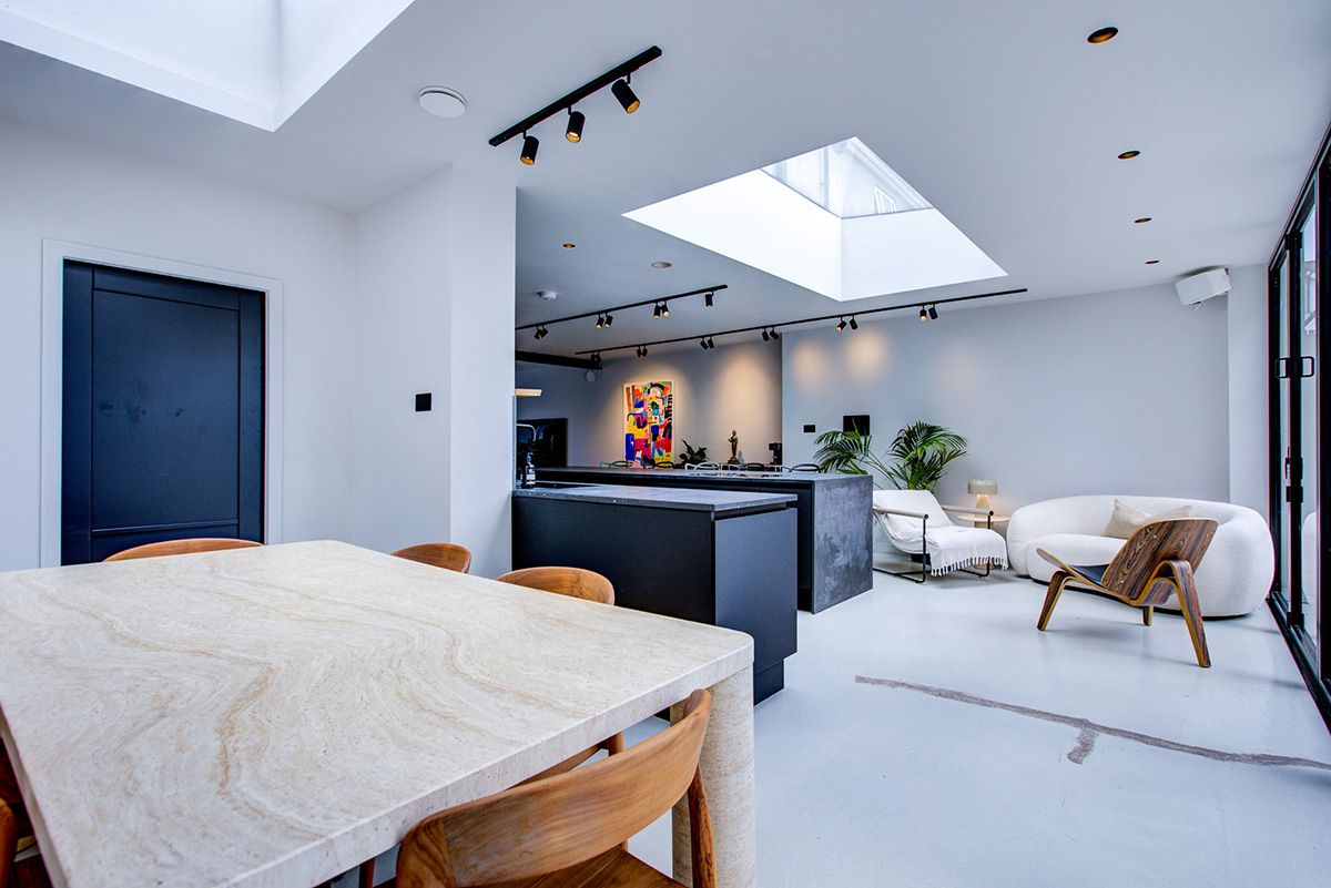 The new space was carefully wrapped around the existing property, creating an open-plan arrangement while defining distinct zones to avoid the interior feeling overly expansive or undefined. Within this layout, a ground-floor wet room and a dedicated office were seamlessly integrated, enhancing both functionality and day-to-day living.